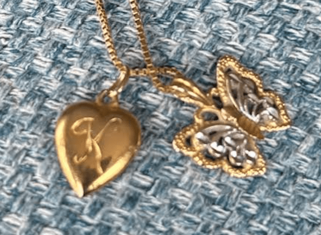 The gold heart charm was a gift at my baptism; it has my birthdate engraved on the back and my first initial engraved on the front. The butterfly was a gift when I earned my Master’s degree. I’m wondering, in the middle of this Good Friday service, why my mind has been drawn to this piece that never leaves my neck. Perhaps I’m realizing how loved I’ve been (in spite of human frailty, error, and circumstance) for my whole life; perhaps I’m noting the significance of the butterfly as a symbol of my insufferable belief in transformation; perhaps because my birthday falls during Holy Week, I’m acknowledging — again — that my whole life has been an object lesson in the power of grace to restore a life.